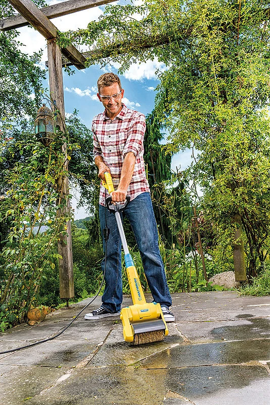 Messinggecoate staaldraadborstel (diameter 100 mm, lengte 165 mm) voor de krachtige reiniging van steenoppervlakken. Geschikt voor de behandeling van hardnekkige vervuilingen zoals korstmos op ongevoelige/robuuste oppervlakken.