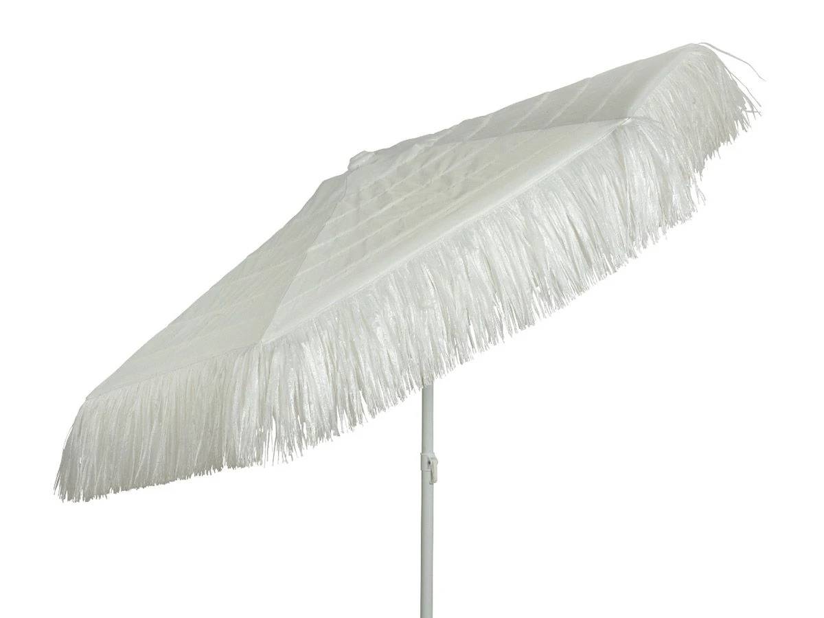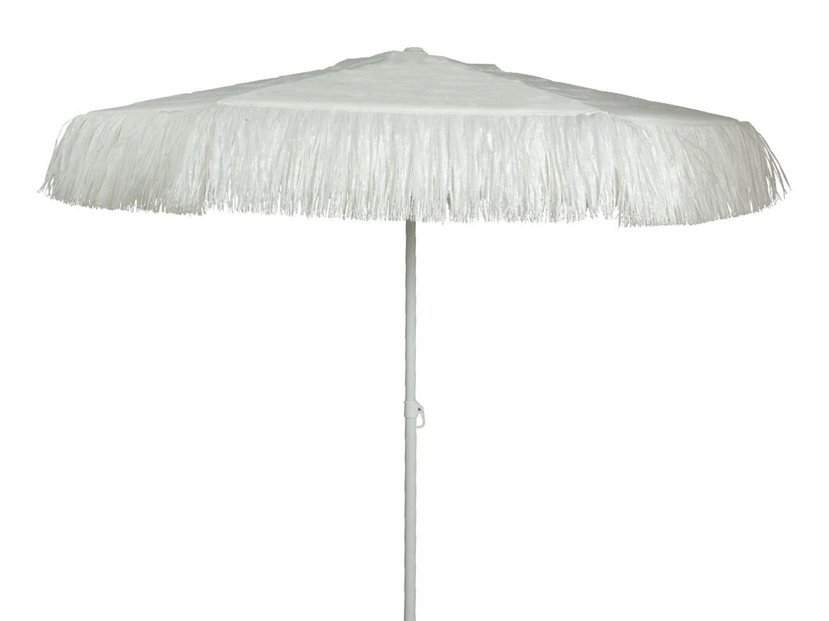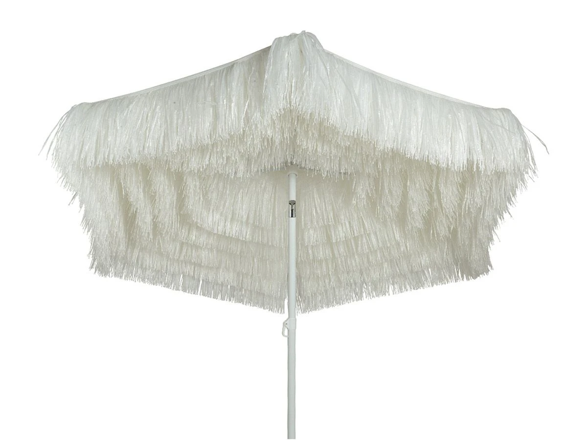 Wil jij in de tuin het gevoel hebben dat je op een zonnig vakantieoord bent? Met de Outdoor white polypropyleen parasol komt dit helemaal goed! Deze parasol beschermt jou niet alleen tegen de felle zonnestralen maar geeft ook optimaal sfeer dankzij de speelse franjes aan de binnenkant.