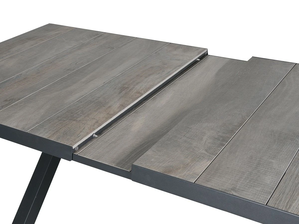 De tafel heeft een stevig frame van aluminium met daarop houtlook tegels van keramiek. De tafel is duurzaam, onderhoudsvriendelijk en weerbestendig. De tafel heeft een hoogte van 78 cm en is strak vormgegeven met een mooie X-poot.