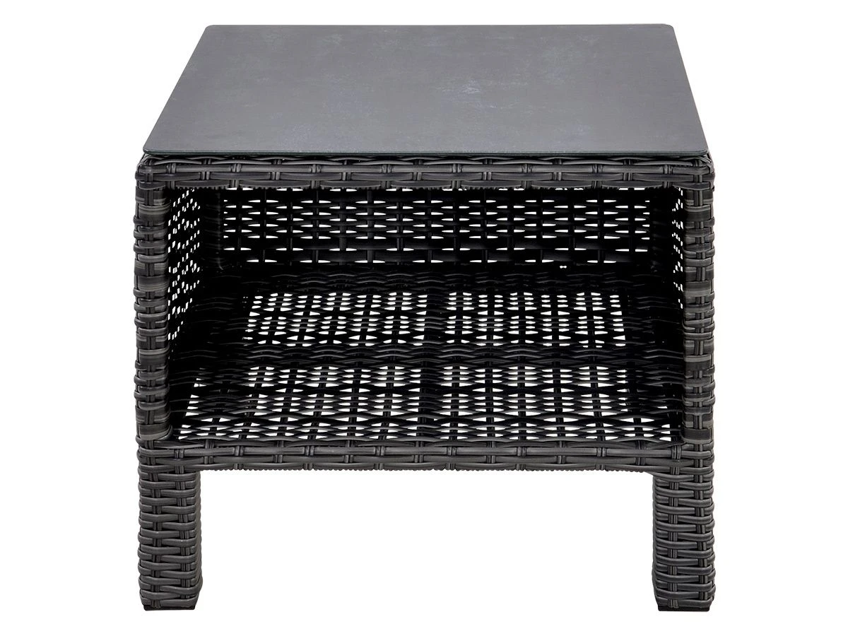 De Santos bijzettafel heeft een lichtgewicht aluminum frame met daaromheen een vlechtwerk van kunststof wicker. Het 5 mm dikke glazen blad heeft een ceramische coating met een mooie antraciet gemêleerde kleur. Het tafeltje heeft een afmeting van 50,5 x 51 x 44 cm en is daarmee perfect te gebruiken als bijzettafel bij je loungeset of relaxstoel.